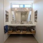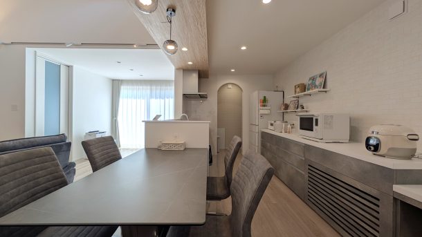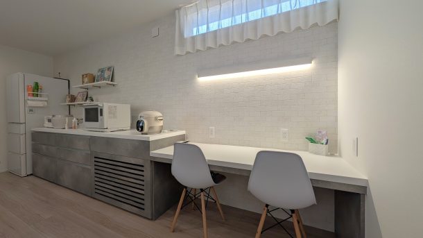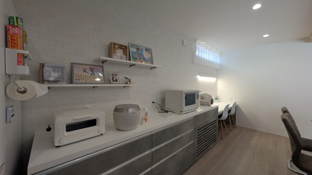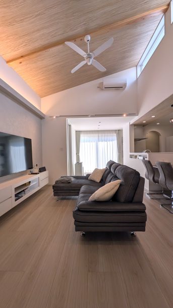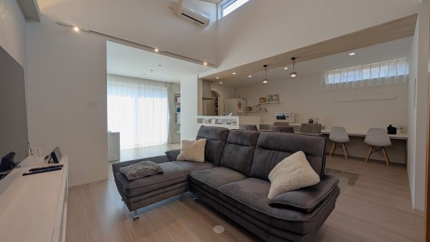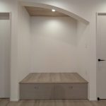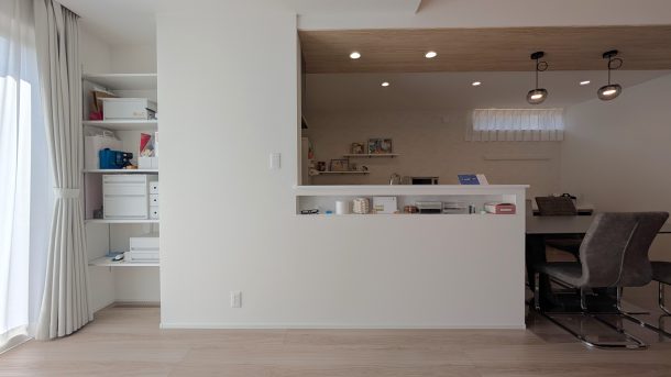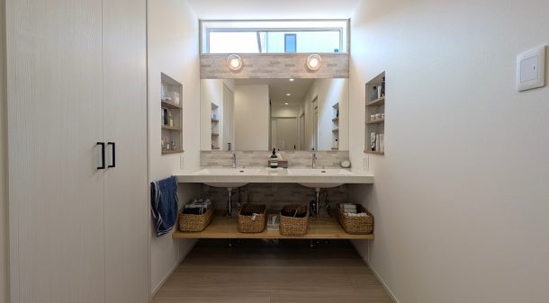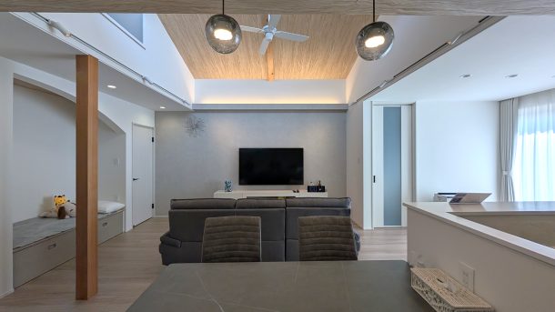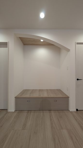 ヌックスペースやR形の垂れ壁、間接照明や造作の洗面カウンターなど、お施主様の『好き』が詰まった素敵なおうちになりました。